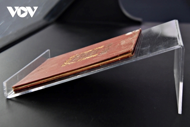 | Bìa dùng để phát biểu của Chủ tịch Hồ Chí Minh tại Hội trường Quốc hội khóa I được trưng bày trong dịp Triển lãm 80 năm thành tựu đất nước |