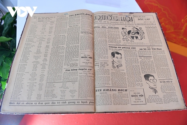 | Ngoài những hình ảnh, công chúng có thể cảm nhận rõ nét không khí Cuộc Tổng tuyển cử đầu tiên của Việt Nam qua những trang tư liệu lịch sử, đặc biệt là báo chí. Trong ảnh: Báo Quốc hội - Nhật báo chỉ ra trong kỳ Tổng tuyển cử đầu tiên được trưng bày tại Thư viện Quốc gia Việt Nam. |