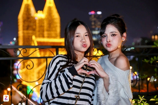 | Đôi bạn đến ban công trung tâm thương mại từ 18h15, ngày 23/12. Nơi đây tập trung người trẻ và các gia đình. Ảnh: Trúc Hồ. |
