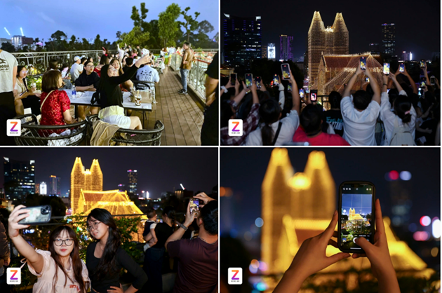 Từ 16h, các điểm có thể ngắm cận cảnh nhà thờ như đường sách Nguyễn Văn Bình, tầng 5 trung tâm thương mại Diamond Plaza, vòng đường Công xã Paris... thu hút hàng nghìn người đến "đu trend" quay video đèn nhà thờ sáng đèn lần lượt từng hạng mục lúc 18h45. Có người trải bạt từ sớm ở công viên 30/4, có người phải vượt quãng đường hàng chục cây số.