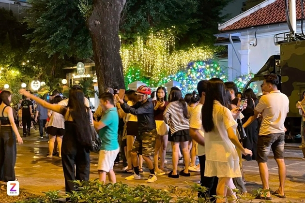 | Lượng người tràn ra đường để chụp ảnh với nhà thờ mỗi tối. Ảnh: An Khương. |